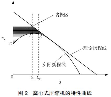 由于離心式制冷壓縮機的葉輪都是后向型,β2 <π/2,所以理論揚程曲線是一條單調(diào)遞減的直線;考慮壓縮機的損失,包括機械損失、容積損失、摩擦損失、沖擊渦流損失等,離心式制冷壓縮機的理論性能曲線和實際性能曲線如圖2所示。其中A 點為實際揚程最高點。機組運行在0到QB 區(qū)域內(nèi),QA 點的附近是最佳工作區(qū)。高于實際揚程線的外部區(qū)域就是喘振區(qū)域。