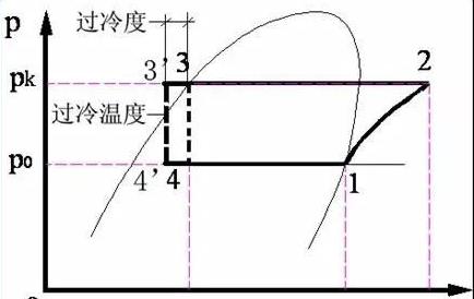 過冷是為了使節流前的制冷劑液體減少在節流過程中產生的閃發氣體,減少閃發氣體所占容積的比容,提高單位制冷量;同時也提高了回氣的過熱度,對保護壓縮機不處濕沖程運轉,都有一定的好處。過冷度在壓焓圖的表示: