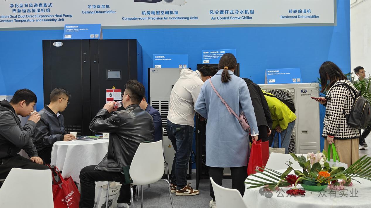本次展覽中,眾有實業展示了多款創新產品,包括工業除濕機、機房精密空調機組、凈化型直膨式變頻恒溫恒濕機組以及恒濕機(除濕加濕一體機),充分展現了公司在制冷領域的強大研發實力和創新能力。